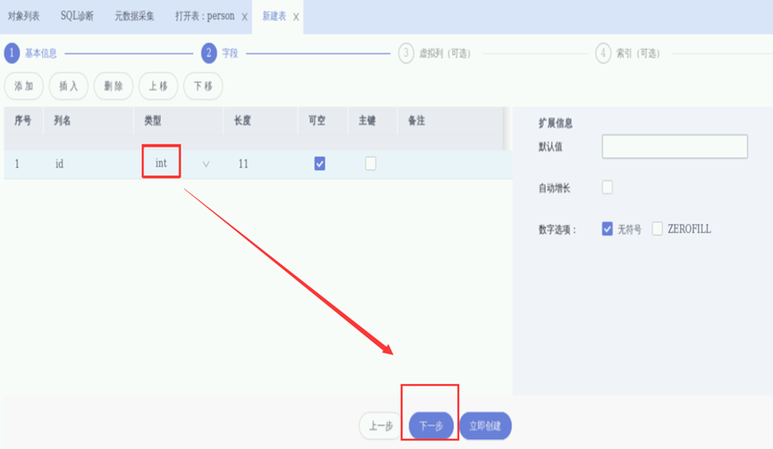 点击“下一步”,添加表字段,点击“立即创建”、“执行脚本”。① 列名:id② 类型:int③ 可空 :勾选其他项默认即可