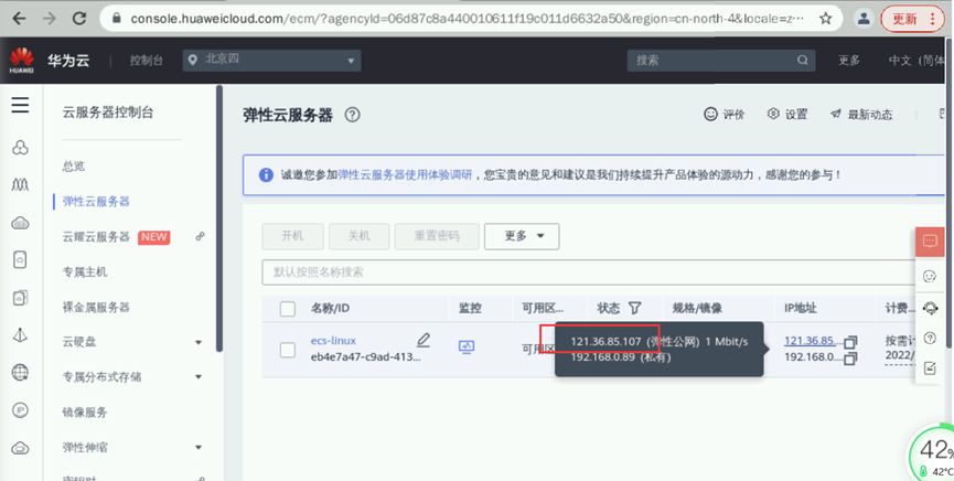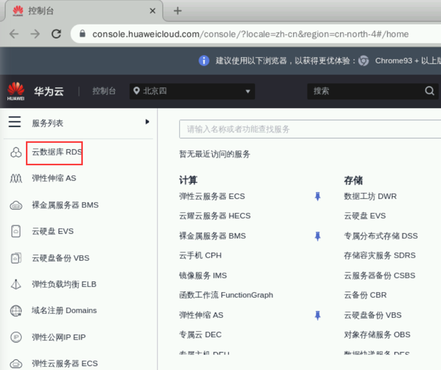 返回控制台,在服务列表中找到弹性云服务器ECS(实验环境中已经预置了一台Linux云主机,云主机的VPC和安全组与RDS实例保持一致)。