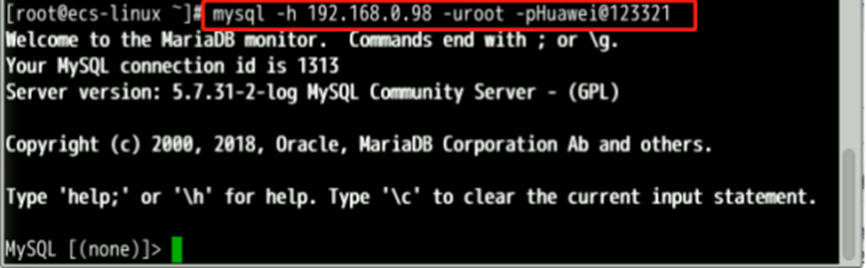 输入以下命令,以连接目标主机MySQL。使用云数据库RDS的内网IP替换命令中的【RDS内网IP】;用RDS实例密码替换命令中的【RDS实例密码】;