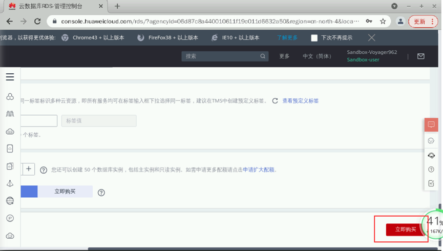 单击“立即购买”,规格确认后,点击提交。(如果需要重新选择实例规格,单击“上一步”,回到上个页面修改实例信息)。