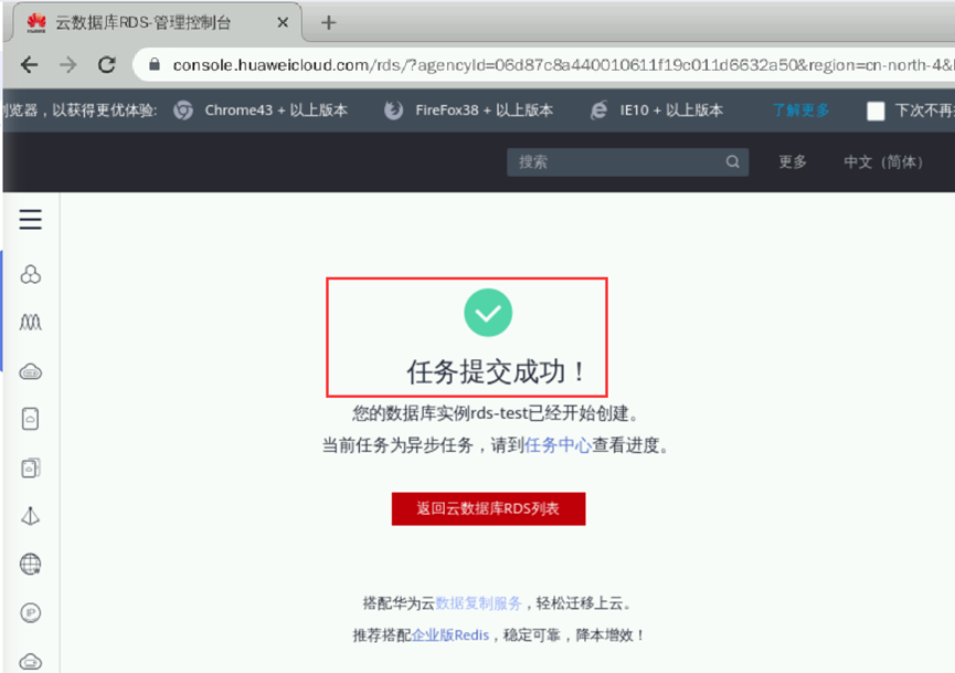 创建实例过程中,状态显示为“创建中”,此过程约5~9分钟。单击 刷新列表,可查看到创建完成的实例状态显示为“正常”。