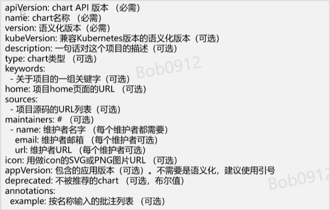 • Chart.yaml:chart包的元数据, 包含了chart信息(比如名称、版本号)的YAML文件。