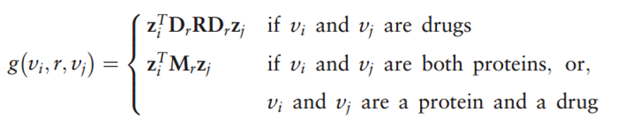 - 通过函数g,对一个(vi,r,vj)打分,分数意味着vi和vj通过side effect type r作用的可能性有多大