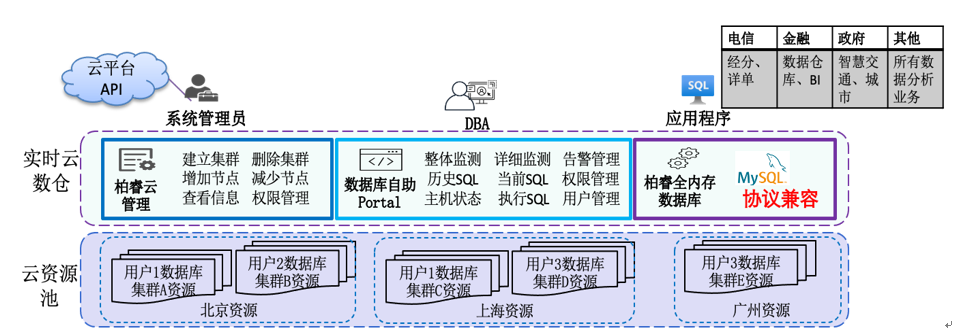 - SQL应用程序接口:底层基于柏睿数据全内存分布式数据库,通过数据库网关为应用程序提供兼容MySQL协议的数据库服务。每个数据库集群,都使用独立的云资源部署,以保证集群的数据安全与性能稳定。