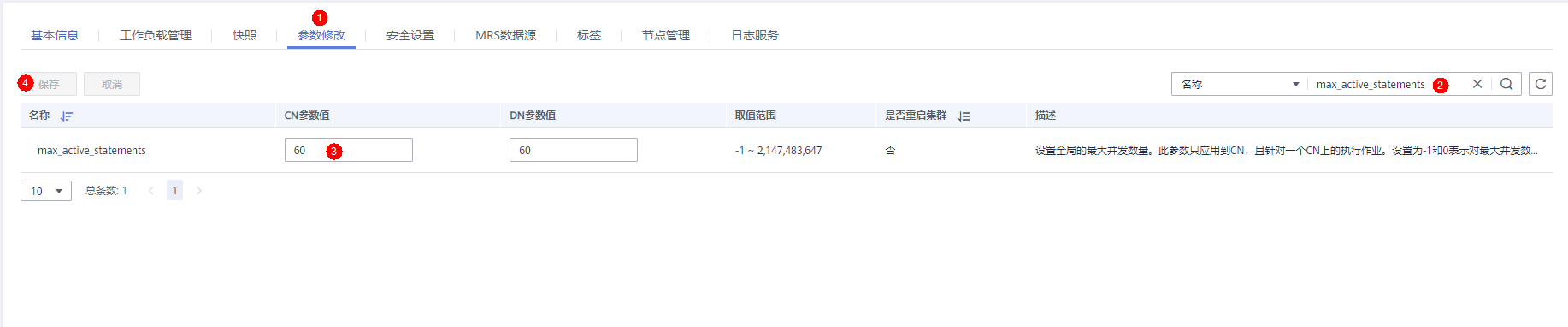 点击集群详情的“参数修改”页面,搜索需要修改的参数,会显示对应参数和当前值,参数值框里面输入修改值,点击“保存”按钮保存配置。“是否重启集群”栏显示“是”的参数说明需要重启集群生效,请寻找业务空闲期修改。