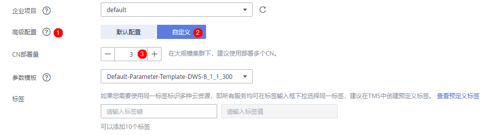 CN数量在下发DWS集群时可以配置。默认值3个,最少2个,最多不超过“节点数量”,如果节点数量大于20,则CN数量最多可配置20个。如下图所示,在“创建数据仓库集群”的购买页面的“高级配置”选择“自定义”,“CN部署量”即为CN的初始部署数量。