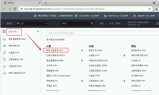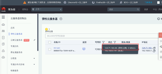 点击左上角“服务列表”再点击“弹性云服务器ECS”,进入弹性云服务器ECS管理列表,在此可查看预置的弹性云服务器ECS的弹性公网IP,