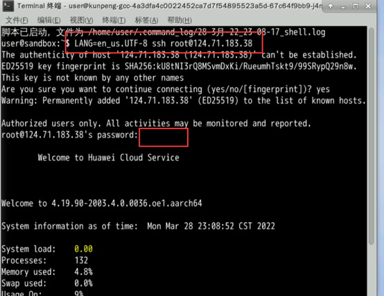 通过终端登录云主机,根据提示输入root账号密码。