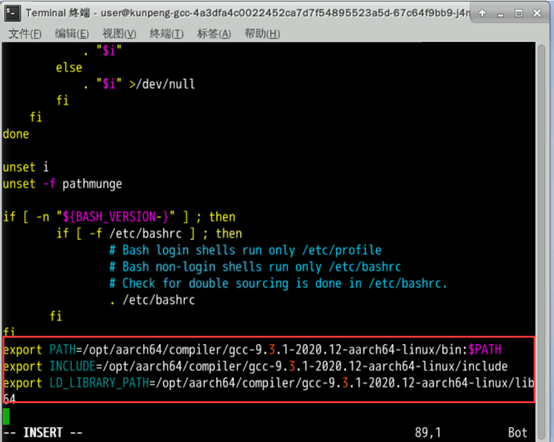 如果输出为空,则表示INCLUDE和LD_LIBRARY_PATH两个环境变量原本没有值;如果输出不为空,则表示INCLUDE和LD_LIBRARY_PATH两个环境变量已经有值。打开/etc/profile文件,并在文件未尾部添加如下字段,并保存。