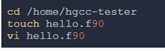选项-mcmodel=medium使能了32bit之外的动态取址操作,这里使用hello.f90 用例来演示验证此功能,此例中有size=85899*1000*10的大符号bar1。首先我们在个人文件夹下创建hello.f90,这里还是以/home/hgcc-tester为例进行演示: