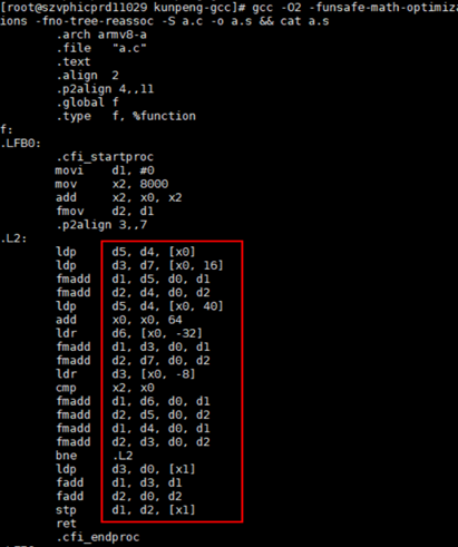 gcc -O2 -funsafe-math-optimizations -fno-tree-reassoc -S a.c -o a.s && cat a.s