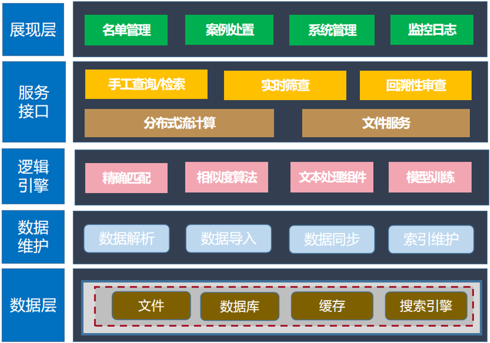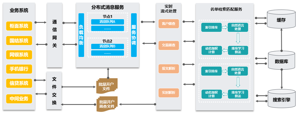 - 可对接全行各业务系统,并提供业务关联方与名单库的实时筛查匹配结果反馈,不会影响关联业务系统的业务处理速度、性能以及用户使用感受;
