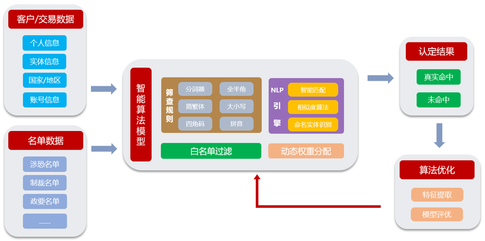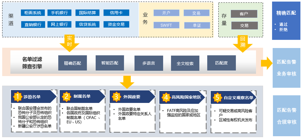 系统具有名单数据管理、智能名单过滤筛查、名单检索、名单回溯性审查等业务功能,提供在海量数据下的高性能精准名单匹配服务,以及认定处置机制,为金融机构进行名单筛查、分析和报告提供强有力的系统工具支撑。