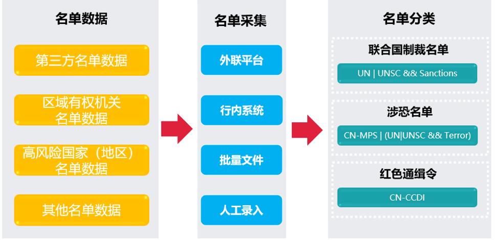 名单数据来源主要包含第三方数据及金融机构内部自定义数据,既具备主流名单数据的解析处理能力,又支持金融机构维护专属私有名单数据,将外部数据与内部数据整合,实现名单数据独立维护,名单类别统一管理,从而建立满足各金融机构业务现状、完善且可持续更新的名单信息库。