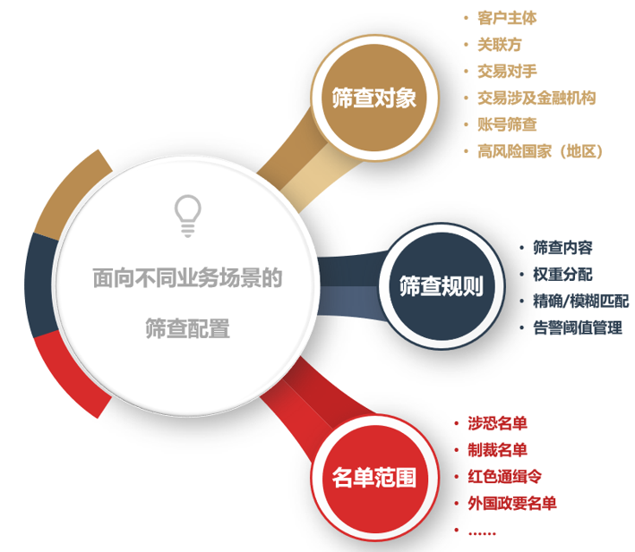 - 可针对业务场景和客户类型灵活配置,根据业务范畴不同,从客户、交易对手及类型的合理确定制裁监测覆盖范围,达到对不同业务场景包括但不限于(业务准入、交易汇入/汇出、报文筛查、客户信息检索、回溯性筛查)的不同监控要求;
