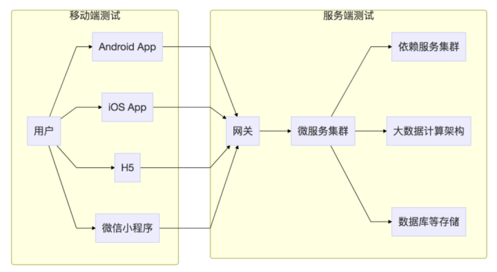 (Application Under Test) 常见的被测系统即需要被测试的 app,网页和后端服务。大致分为两个方面移动端测试和服务端测试,如下图所示: