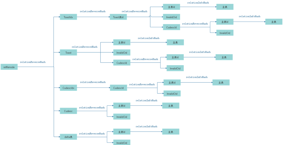 在考虑事务隔离性、考虑表信息的删除的前提下,上图依靠系统表反查的过程中,随时可能因为对应系统表中无相应数据而中断反查流程,这种情况就需要依靠前面消息队列中记录的DeleteRelation、UncommitRelation、UncommitIndex三类消息,再处理消息队列中这三类消息时,我们使用哈希结构(命名为:relationInfoHash)保留主表的相关信息,而对于创建的辅助表,为减小内存占用,我们使用哈希结构(命名为:relationReverseHash)仅保留辅助表的反查关系<辅助表Oid,关联表Oid>,即:
