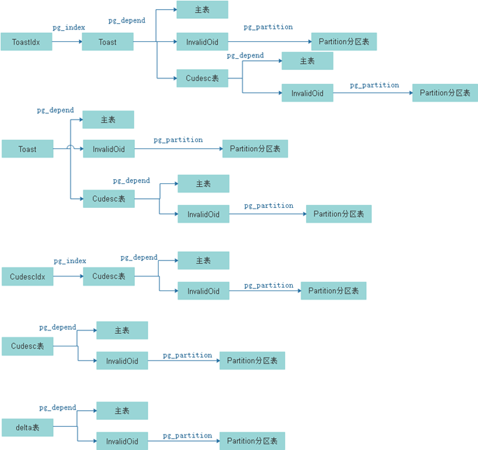 针对以上这5类辅助表,不考虑事务隔离性,不考虑表信息的删除,反查这类辅助表所属主表的查询流程如下图所示,依赖对pg_index、pg_depend、pg_partition系统表的点查操作能逐步找到其主表信息。