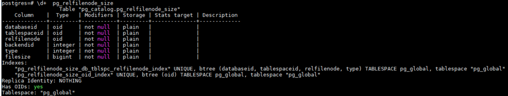 上文中,对于痛点问题2的应对方案中,其实已经提到,为解决查询全库表大小耗时久的问题,最主要的措施就是规避掉磁盘的寻址操作,那就需要在查询动作触发之前,计算出每个物理文件大小并缓存下来;为此,我们引入了pg_relfilenode_size系统表,其表结构定义如下: