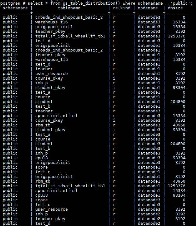 在pg_relfilenode_size系统表的基础上,GaussDB(DWS)在8.1.3版本提供了快速查询全库表达小函数gs_table_distribution(),其查询结果示意如下所示,返回内容为某个表在各个数据节点上的表大小。