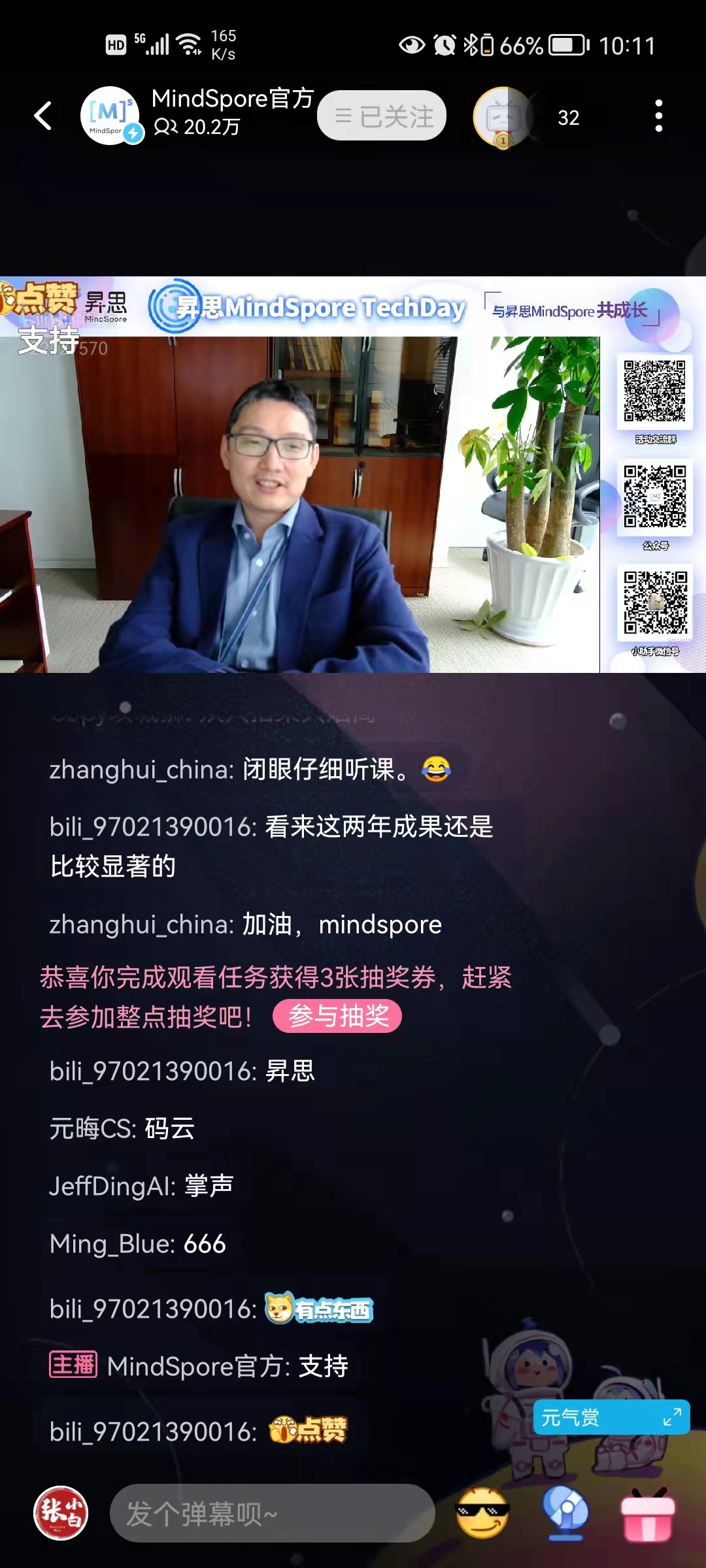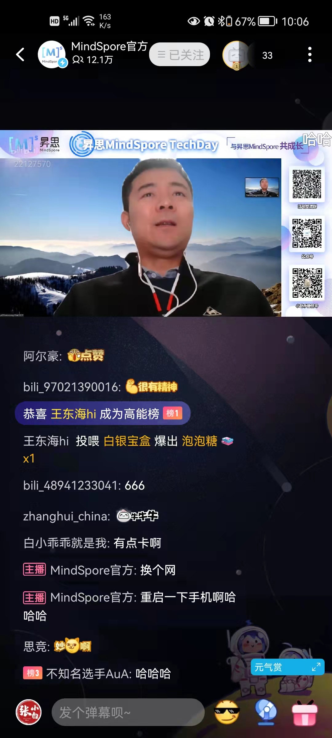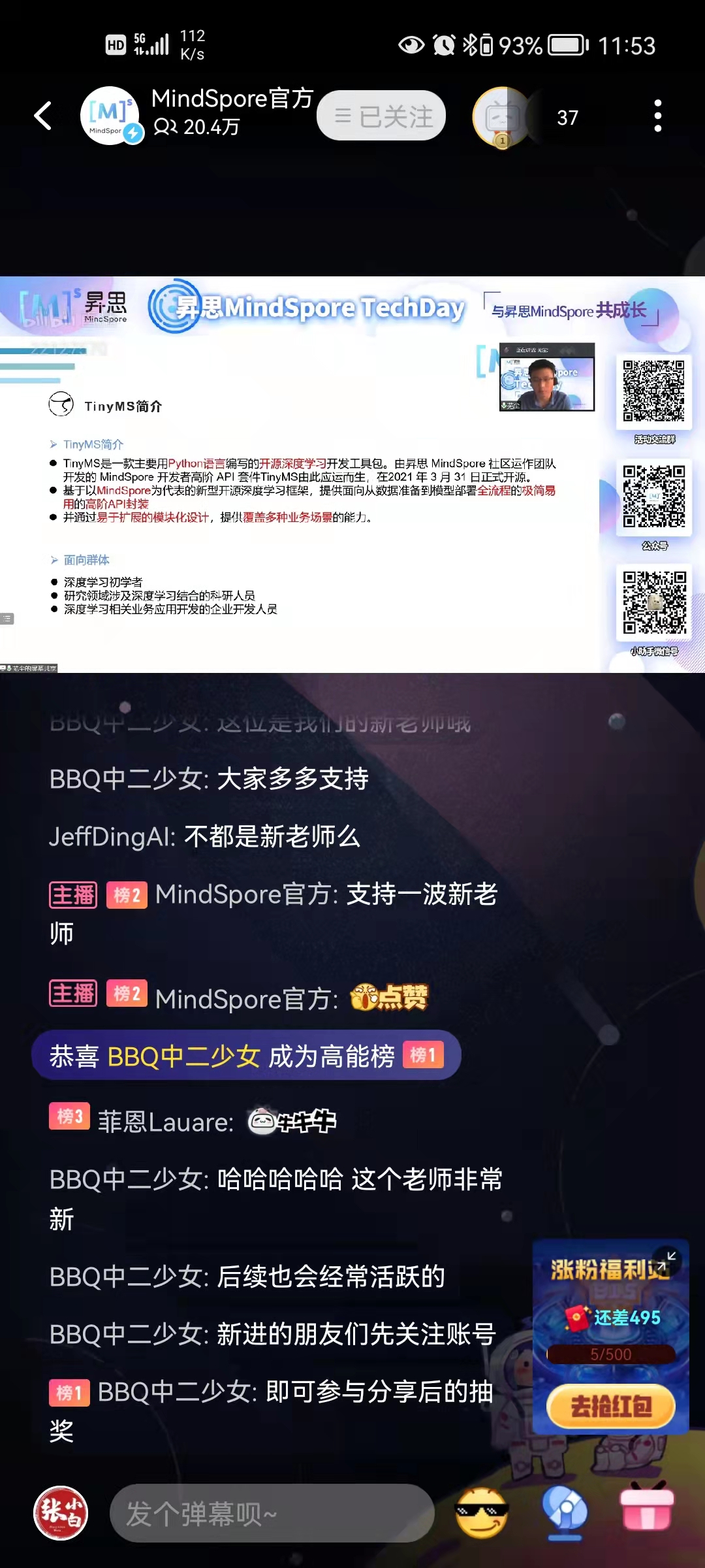 然后,第二个资深布道师 项靖阳 大大介绍了 他跟MindSpore是如何相识、相爱。。。。他还很热心的回答了直播间网友的提问。