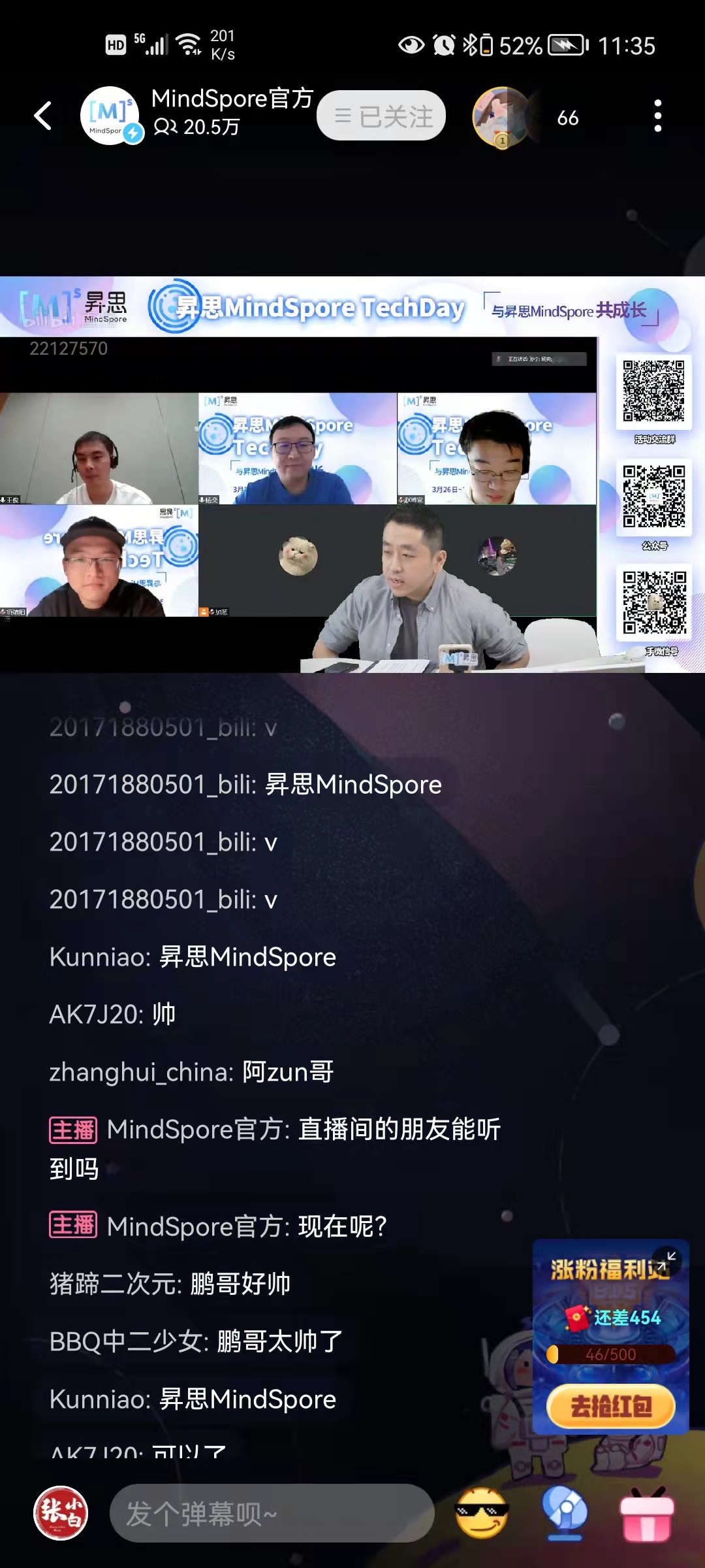 紧接着,黄之鹏 让两位大大和 鹏城实验室的 杨奕 大大 以及 MindSpore的著名布道师 阿ZUN哥,一起讨论了很多关于MindSpore的事情: