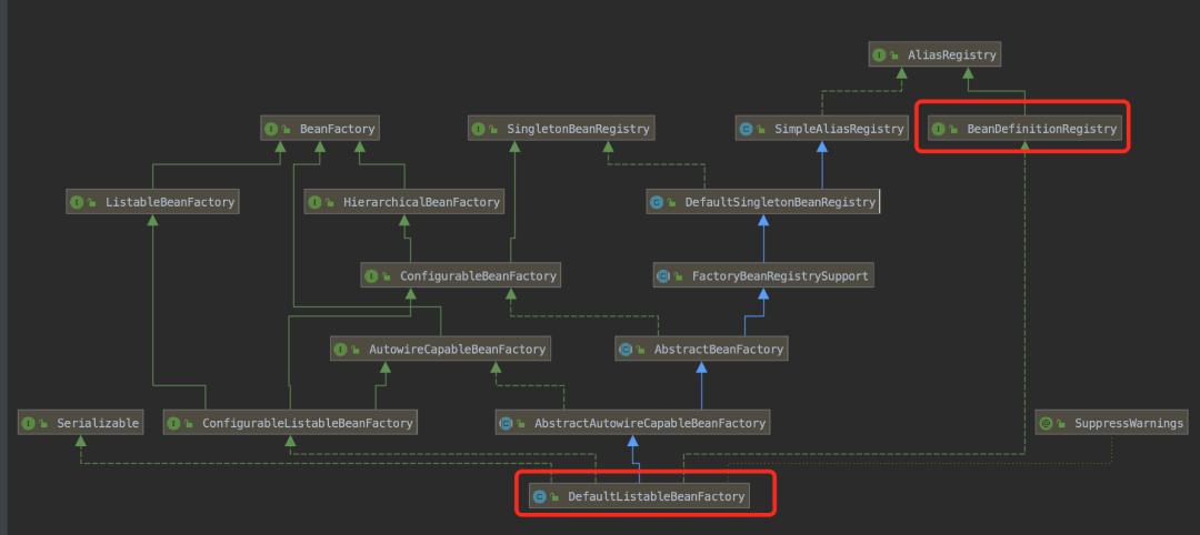 从下面这张图能够看出DefaultListableBeanFactory就实现了BeanDefinitionRegistry接口。