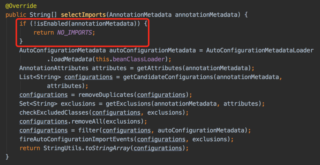 并且重写了selectImports方法,该方法会根据某些注解去找所有需要创建bean的类名,然后返回这些类名。其中在查找这些类名之前,先调用isEnabled方法,判断是否需要继续查找。