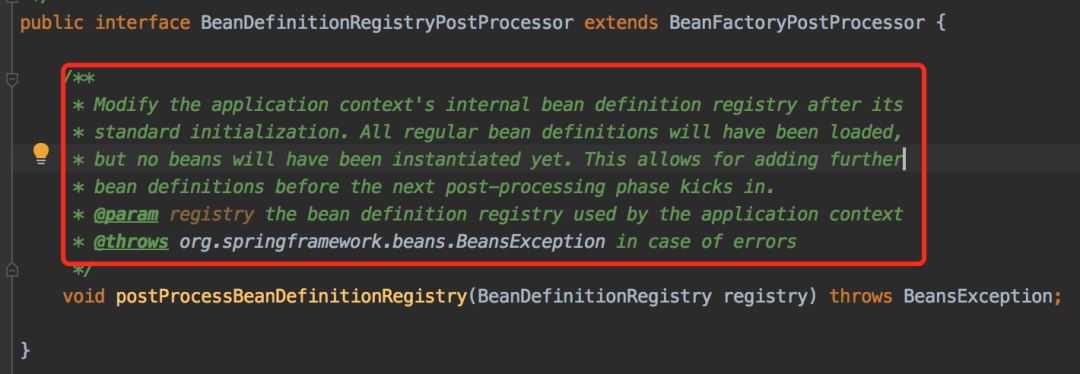 该接口的方法postProcessBeanDefinitionRegistry上有这样一段描述: