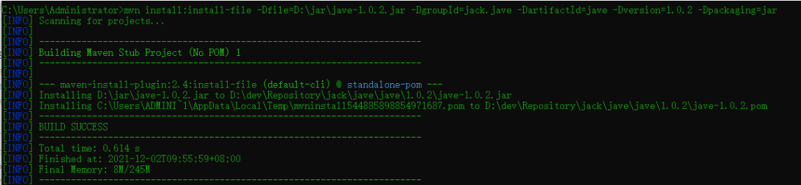 配置完参数 使用CMD运行打包命令:mvn install:install-file -Dfile=D:\jar\jave-1.0.2.jar -DgroupId=jack.jave -DartifactId=jave -Dversion=1.0.2 -Dpackaging=jar