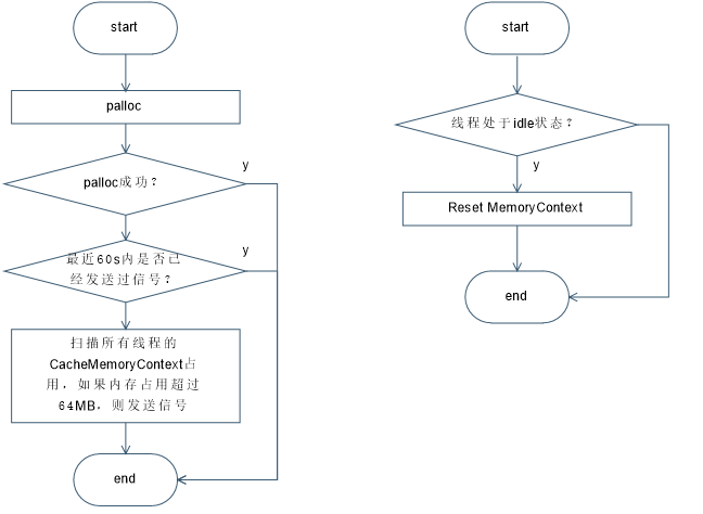 图中左侧和右侧为两个线程,其中左侧线程在执行SQL过程中,在线程palloc内存过程中如果发生OOM错误,则该线程开始扫描其他线程的内存占用,对于内存占用超过64MB的线程,将发送内存清理信号,在其他线程(右侧线程)接收到信号以后,若该线程处于空闲状态,则执行内存清理。该方式有效解决了a)中线程结束后,无法清理的问题。