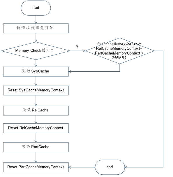 如图所示,为Cache全失效流程图,每个CN线程和DN线程在接收到新请求或事务开始时,将做一次Cache占用判断,如果Cache占用超过256MB,则执行一次全失效,清空Cache。