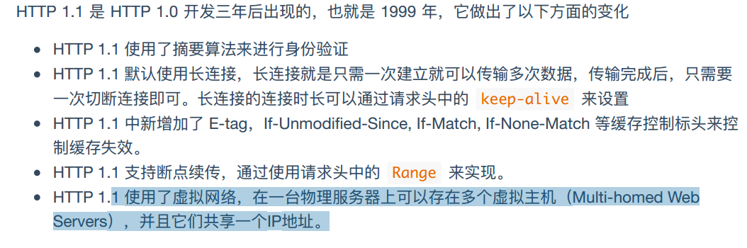 第一个在通讯中指定版本号的HTTP协议版本,常用于代理服务器。 成为了面向事务的应用层协议,该协议需要每请求一次响应建立并拆除一次连接, 引入了POST和HEAD命令 相对于一版本在一定程度上保障的数据的传输安全,是一个典型的串行连接事务。 缺点: 串行处理,效率低下 -