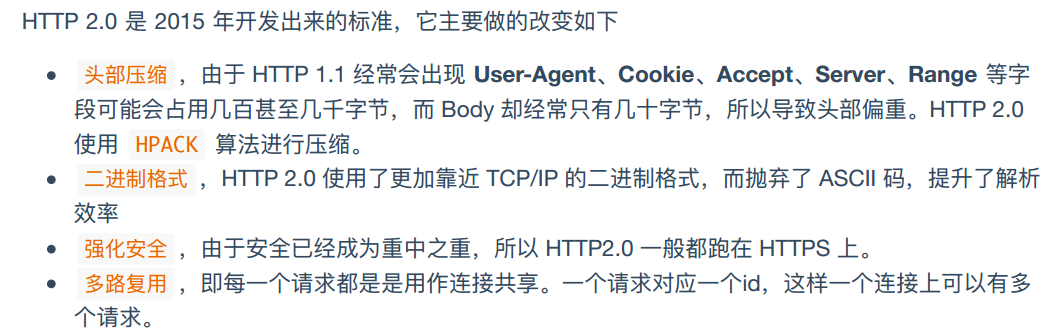 1、HTTP/2.0 采用二进制格式,而非文本格式 2、HTTP/2.0是完全的多路复用,非有序并阻塞的,只需要一个链接即可实现并行 3、使用报头压缩,HTTP/2降低了开销 4、HTTP/2让服务器可以将响应主动 "推送"到客户缓存中