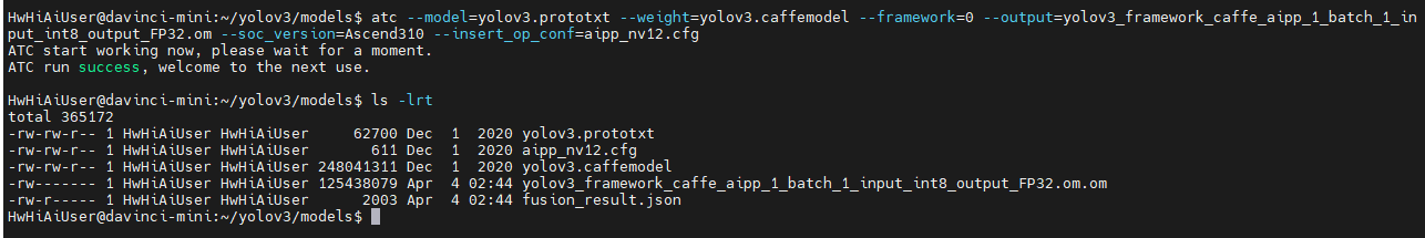 atc --model=yolov3.prototxt --weight=yolov3.caffemodel --framework=0 --output=yolov3_framework_caffe_aipp_1_batch_1_input_int8_output_FP32.om --soc_version=Ascend310 --insert_op_conf=aipp_nv12.cfg