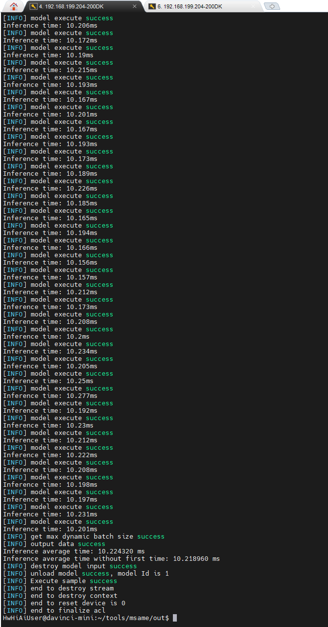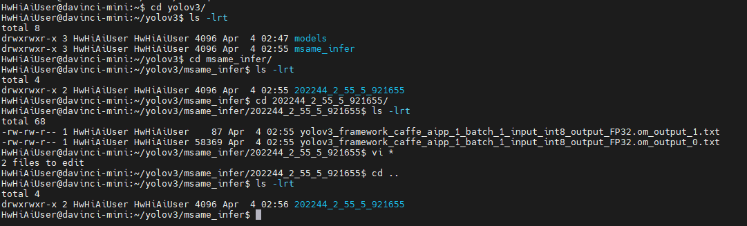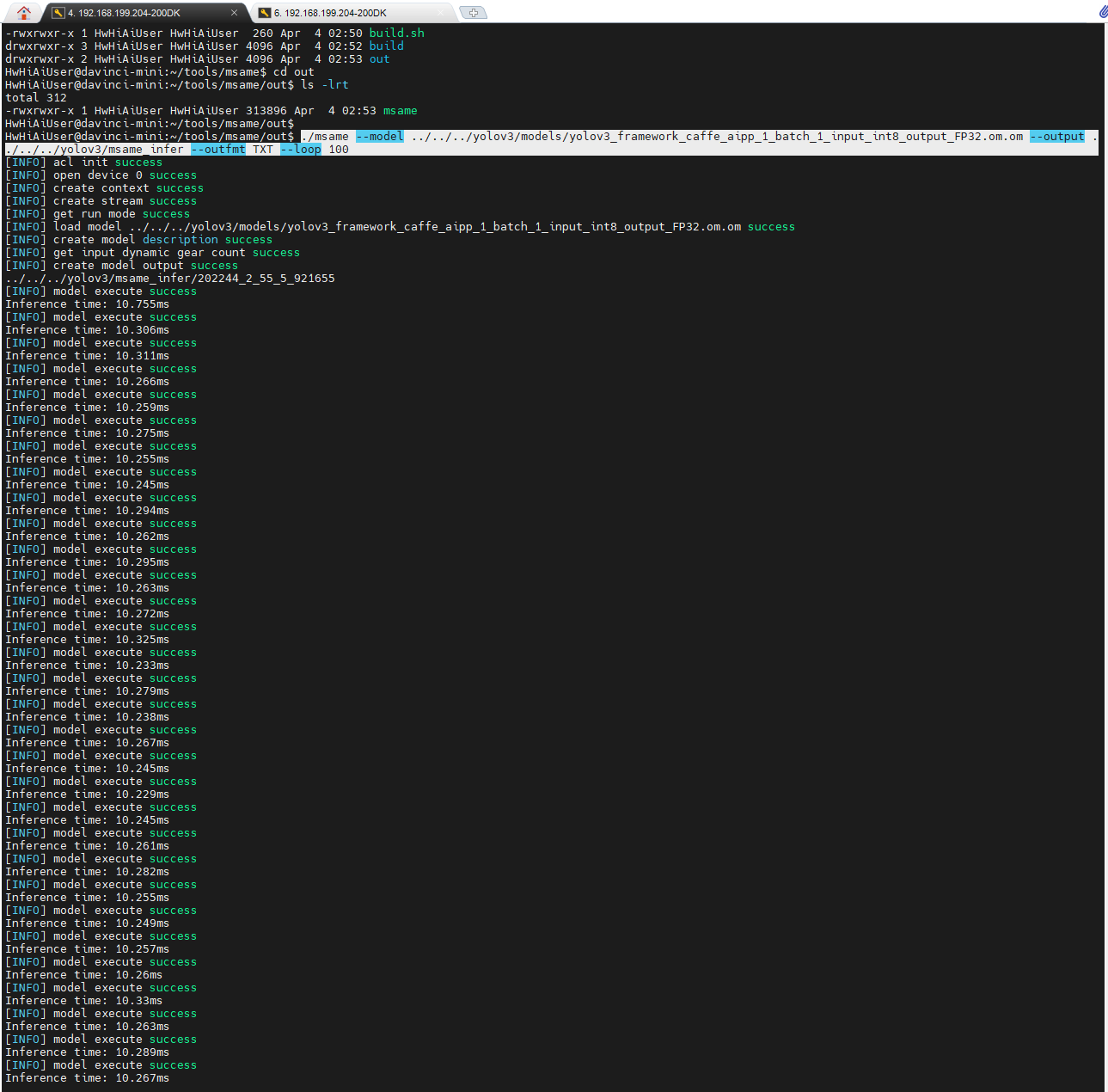 ./msame --model ../../../yolov3/models/yolov3_framework_caffe_aipp_1_batch_1_input_int8_output_FP32.om.om --output ../../../yolov3/msame_infer --outfmt TXT --loop 100