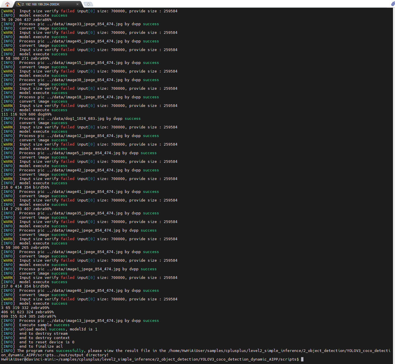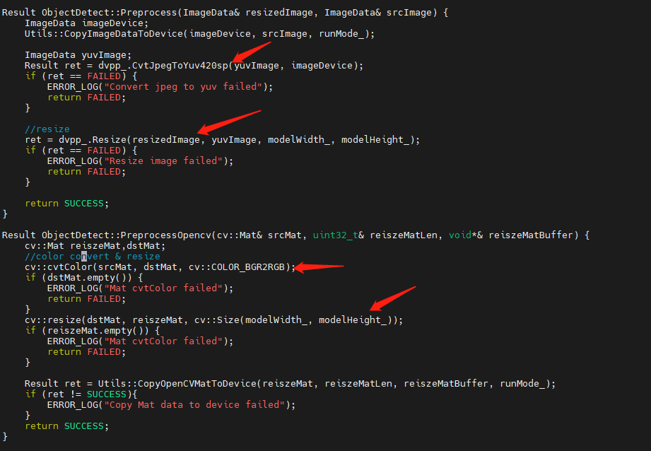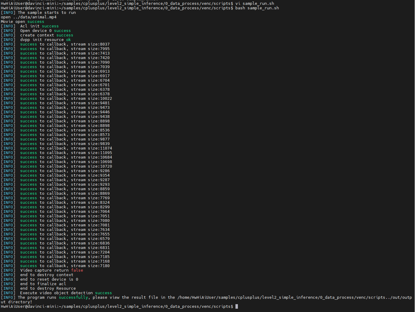 (2)原始视频-》VENC转换-》H264码流文件-》DVPP VDEC转换-》YUV图片(原始分辨率)-》resize成416X416的YUV图片(可选)-》送给om模型推理(其中可以在atc转换时设置 YUV转RGB,以及转416X416的resize)-》模型结果图片-》DVPP VPC转换-》输出结果图片 (如果是多张模型结果图片或许可以拼成输出结果视频)