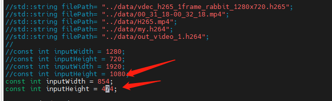 修改vdec的main.cpp中的 inputWidth和inputHeight为 854,474(可参看前面格式工厂中的分辨率显示)