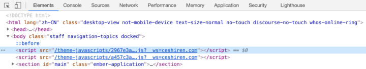 想要查看页面中的 JavaScript 脚本,也需要借助浏览器的开发者工具。按快捷键 F12,进入开发者工具,点击 Elements 面板,然后就可以看到 <script> 标签所处的位置了。