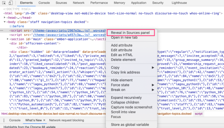 如果想要查看外部 JavaScript 脚本的内容的话,可以在开发者工具的 Elements 界面,找到对应的标签,然后右键选择 Reveal in Sources Panel。