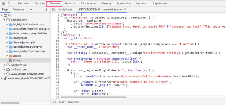 就可以跳转到 Source 界面,在这里可以查看 JavaScript 脚本的内容,并且可以进行调试。