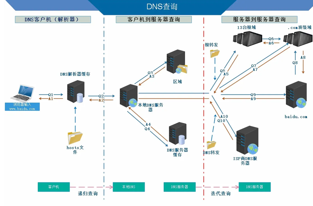 1)查询过程中DNS代理服务器向其他服务器请求的过程称之为迭代查询