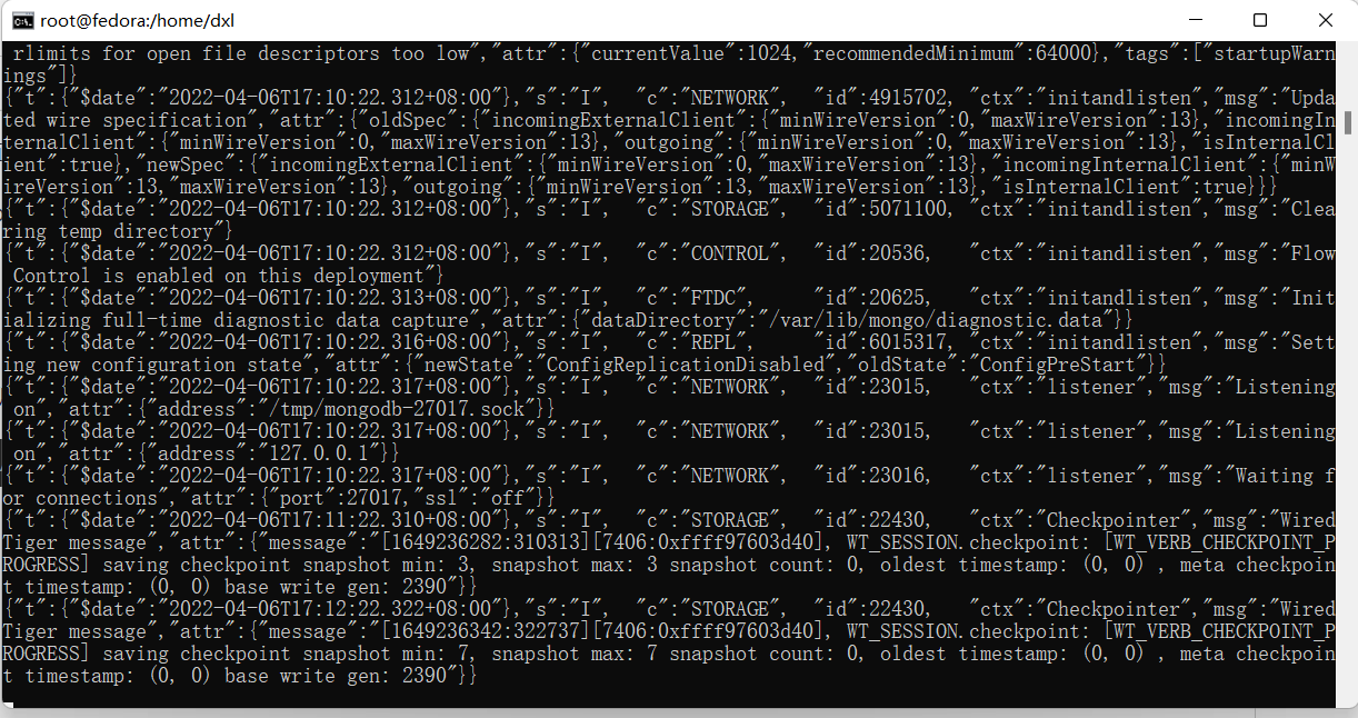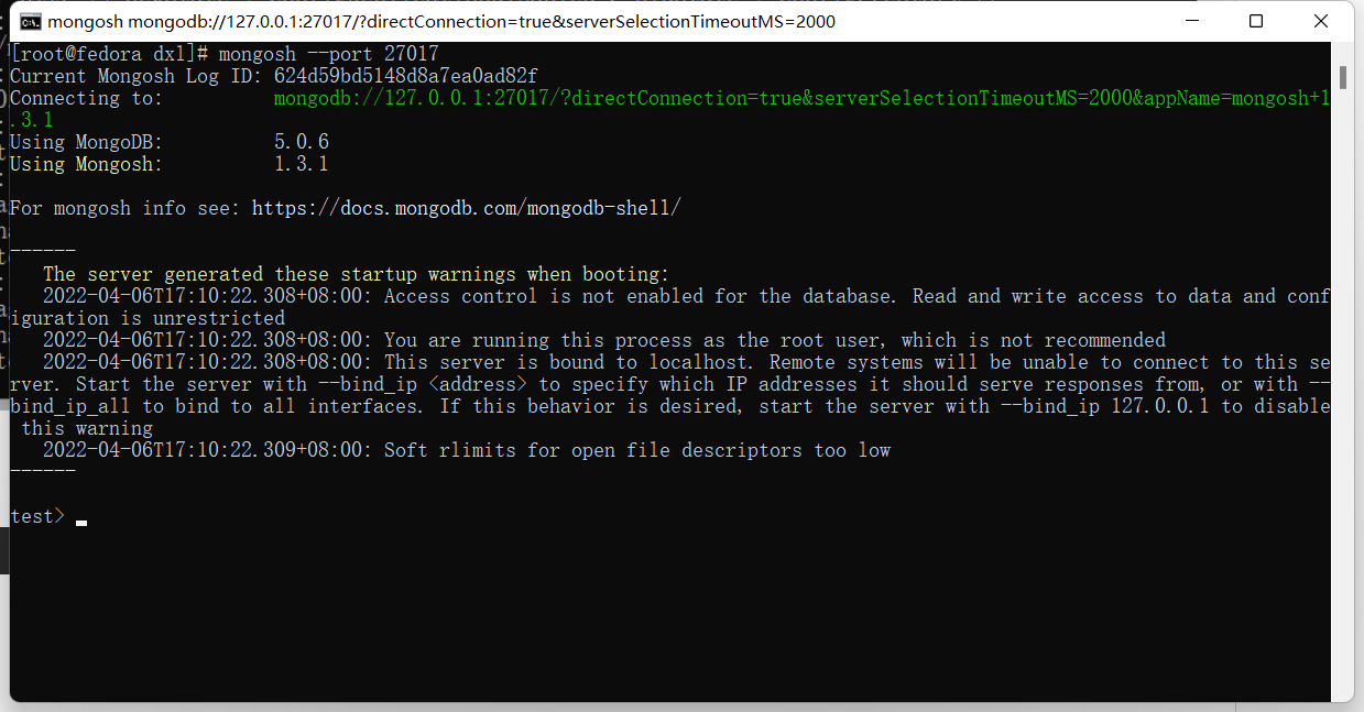 实验环境:fedora 35 ARM,mongodb 5.0,mongosh 1.3