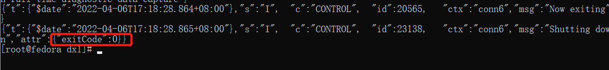 执行上方命令后在我们启动mongodb服务的窗口可以看到数据库服务退出进程: