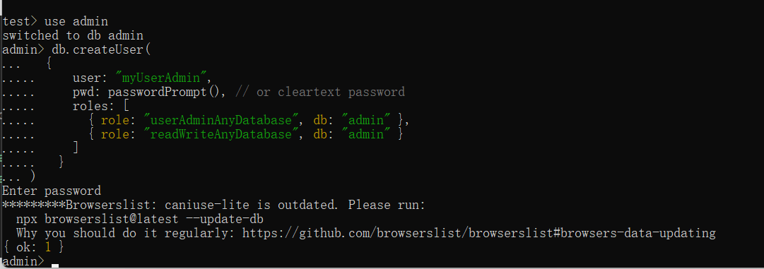 - 这里创建的是用户管理员,如果需要其他权限则请参考官方文档:用户角色-MongoDB 手册