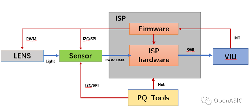 下图[2]展示了一个标准的相机系统结构。它通常包含相机镜头模组 (LENS) /光学系统,图像传感器 (Sensor),图像信号处理器 (ISP) 以及配套的软件工具,如图像质量调优工具 (PQ Tools)。