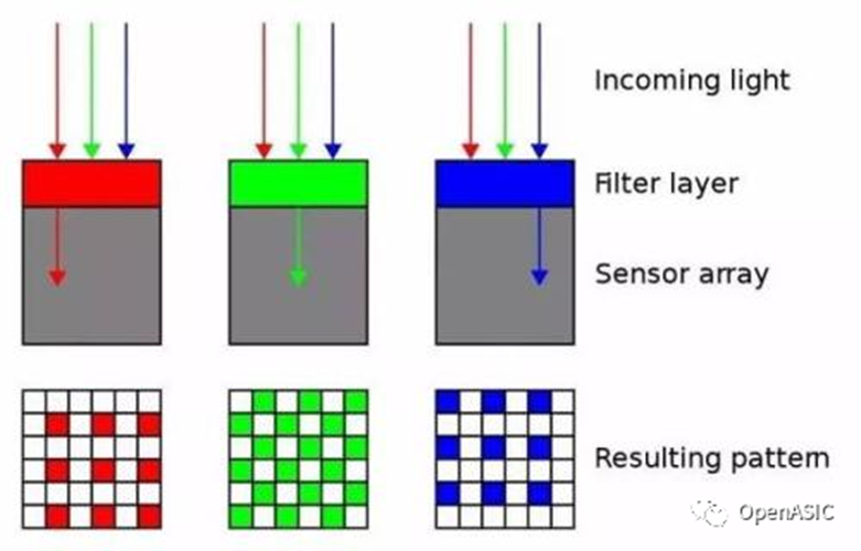 图像传感器 (Sensor) 完成从光信号到电信号的光电转换,光的强弱影响着传感器每个感光单元电荷的分布,电荷的分布变化又影响着电流的强弱(光越强,电流越大),之后再根据电流强弱转换为对应的数字图像信号。而要得到场景的色彩信息,还需要在传感器上增加一层色彩滤波阵列 (CFA, Color Filter Array),让传感器上每个感光单元仅得到一种颜色光的信息。