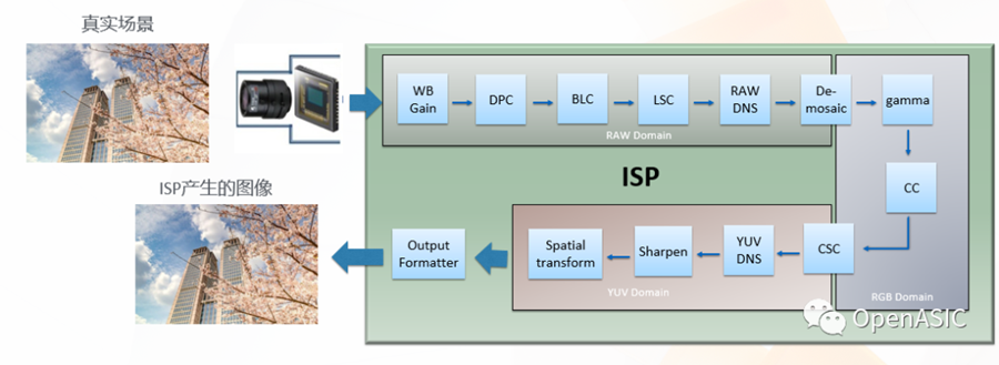 图像信号处理器 (ISP) 会对传感器输出的图像信号进行优化处理以及对相机系统的调节,因此,ISP会设计出多个功能模块去控制各种影响图像质量的关键因素,如清晰度,噪声,色彩,运动,动态范围等,主要的功能模块包括自动对焦、自动白平衡、自动曝光、坏点去除、镜头阴影矫正、去马赛克、颜色矫正、伽马矫正、边缘增强与降噪处理等,同时承担着图像数据的压缩和存储任务。