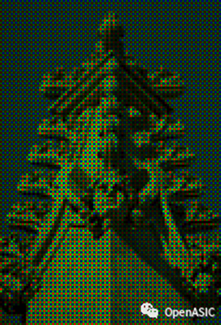 经过这样的设计,传感器采集到的图像就是RAW图像(如下图[3]),即图像每个像素位置仅有一种色彩信息。要恢复真实场景中的色彩,就是图像信号处理器 (ISP) 中的去马赛克模块的任务了。