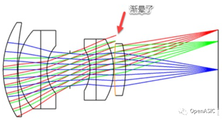 镜头本身的机械结构导致,称为机械阴影 (Mechanical Shading)。镜头的各模块在制作和组装的过程中存在一定的工艺误差,从而影响光线在镜头内部的传播。类似于光学中的渐晕现象,如下图2所示,造成这种阴影的原因主要为遮光罩等机械结构,较大角度进入镜头的一些光线被镜筒遮挡,这些光线进入sensor时的亮度大幅衰减。